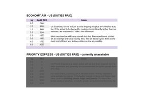 Shipping services range from least to most expensive as follows: SAL → Economy Air → EMS → Express Courier. SAL and Express Courier represent the lowest and highest tiers. If your country is not included, please refer to a nearby country for an estimate.